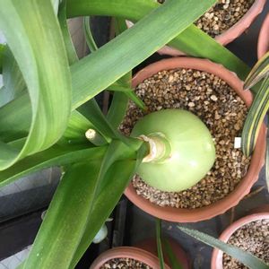 オーソニガラム コーダツムのその後✨ 現在育成用ライトの下で成長中です💡 球根を頂いた時は小さめなギンナン風だったのですが、最近はプックリして表皮が裂けてきました😆 相変わらず芽が一本ヒョロッと伸びたままですが、球根を見る限り無事に育っているので安心しています。 話を聞くとこのコーダツムは玉ねぎサイズになるよう。 目指せ玉ねぎサイズです👍✨