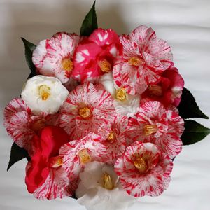 ツバキ 我が家のツバキの1本。 1本の木にいろいろな色の お花さんの顔が 見られます。 楽しくお話ししている かのようです。 o(^-^)o(@^▽^@)٩(๑❛ᴗ❛๑)۶