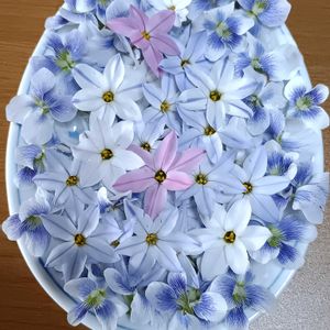 花手水 我が家の小さな庭からの ささやかな贈り物🎁です。 命短いハナニラとスミレで ちょぴり遊んでみました。 可愛いお花さんに 感謝です。 (*_*)٩(๑❛ᴗ❛๑)۶