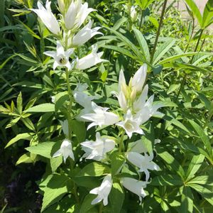 コンパニオンプランツとして植えられていたカンパニュラorホタルブクロの仲間だと思います☺️ こうして咲いているのを見ると素敵だなぁ💕と思いますが、ウチのホタルブクロのようにはびこると困ります💧