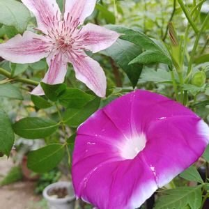 アサガオとクレマチスが咲いていたのを発見。 思わず感激