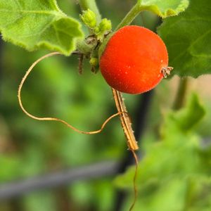 なんだ君は😧 出身地はどこ? このフェンスには、火星人と亀甲竜、アデニア、コラロカルプスのツタが絡まっています あみだくじのようにツタをたどって行くと、コラロカルプス バイネシーの塊根にたどり着きました 種子から育てて数年 ようやく実を結ぶことができましたよ😃 探して見ると、カラスウリの実のように、シマシマのスイカのような緑の実もあるじゃないですか! 収穫はどうすればいいのかな?弾けるのか?乾いて割れてこぼれるのか? 観察していきます