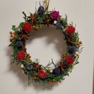 新年あけましておめでとうございます。 新年っぽくはないですが余り物でミニリース。 ヒムロスギ、アイスブルー センニチコウ、エリンジウム ヘクソカズラ、ナンキンハゼ、シキミ