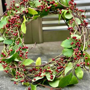 ♡アケビとノイバラのリース♡山野の探索🚶♀️(5枚投稿) 画像の英字は 学名Euonymus sieboldianus Rosa multiflora 今年もアケビとノイバラのリースを作りました。 材料はアケビとノイバラだけ! アケビのツルをくるくる丸めてノイバラの実をさしこんだだけの簡単ナチュラルリースです。 いろいろな角度でご覧下さいネ🙇♀️