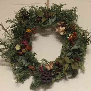 友人の依頼で自然の素材を使ってリースにしました。 サンキライや紫陽花のドライフラワー、シダーローズ。
