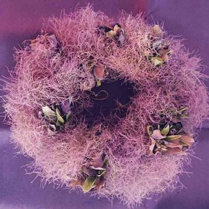 紫のスモークツリーと、クリスマスローズ、夏のあいだにきれいにドライになりました。 シックなドライフラワーのリース。