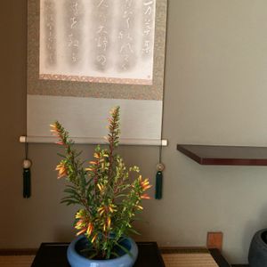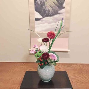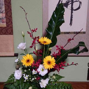 新年になり… 本日は🍵茶道の社中の初釜でした。 床にはお正月飾りの柳と紅白の椿が生けてありました。 自宅の庭の木瓜と水仙が咲きはじめたので持参したところ早速床飾りにと、、、 ご指導頂いてる先生に生けてもらえました。 花を生けるとは=植物を切り取った自然の草木花の生気を「生かす」と云うことに通じてます。自然に野にあるようにと。言われています。 お正月の趣向なので 🍱御節料理と 主菓子の『 花びら餅 』を頂いて~ 🍵お濃茶と薄茶を頂いてお稽古仲間と楽しいひとときを過ごしてきました。