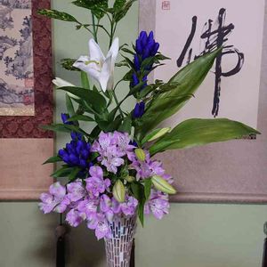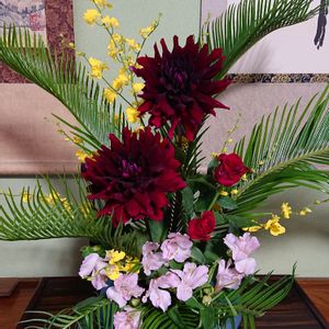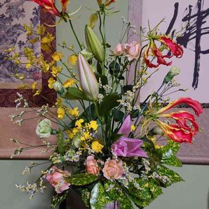 おはようございます🌥️ 久しぶりに生花のアレンジメントしました。 今回は、グロリオサをメインに華やかに生けました。