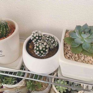ちなみに…二段目の多肉たち🌵 こちらは貰い物ばかりです✨ 左のサボテンさんは、私が小学低学年の時に貰ったものなので、20年くらい前から育てているのですが、母が買って来たものですし、名前も知らずに今日まで育てています😂 もっと長かったんですが、落下してしまって折れたものを植えたらしっかり根が張ってくれました。 真ん中はこの間買ってもらいました、明日香姫です🌵 そして右は、妹が半年くらい放置していてシワシワになっていた多肉さんを引き取りました。こちらも名前が分かりません😓 ネットを使い、見比べて調べてみましたが、やはり素人の目では自信がありません…😭 皆さん、詳しい方ばかりなので、これを機会にと思い、もし、この写真だけで分かる方いらっしゃったら教えて頂きたいです❗️ 質問ばかり良いのか分かりませんが…💦 どうぞ、よろしくお願いします🙏💕