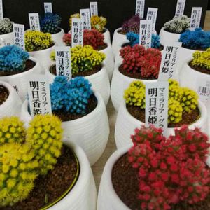 エルサムと明日香姫 エルサム(ダイソー出身)を見てると目が回るwww 明日香姫は着色されて売ってたやつ。 青が綺麗だったんだけどねぇ。 成長した部分は白い。 明日香姫は銀手毬のモンスト品種だそうな。