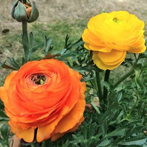 こんにちは👋😃 2月に入り…きのうは立春でしたね☺️ 一週間振りに小さな庭を見回ると 今まで元気がなかったパンジー・ビオラも 何だか急にモリモリしてきましたよ😁 春を感じましすね~♪ こちらも気分はウキウキします🤭 その中でも今日一番の元気さん💕 ☘️ラナンキュラス☘️イエローとオレンジ💛🧡 小さな庭が明るくなります😊