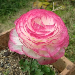 こんばんは☺️ 朝から曇りの一日でしたが☁️ 今になってお日さまが出てきましたよ~🌞 4年目の☘️ラナンキュラス☘️です👍 今年は一輪だけですが…咲きました🖐️ 花言葉の通り…とても魅力的な花は 一輪だけでも晴れやか♪華やかです✨✨✨