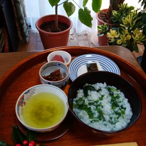 『七草粥🍚🥢』 🎍正月過ぎると 七草粥セットをスーパーで 売ってますね❣️ 昔は寒い時期の野菜不足で 早春の野草を取って🌱 春の七草をお粥にして 食べていたのでしょうね❣️ 現在ではなかなか七草🌱を 集めるのは大変ですが パックでまとめて買えますから 便利になりました❣️ 朝からお粥で 胃に優しく食べれました🍚🥢❣️ 今年一年の無病息災を 祈りました💕🙏