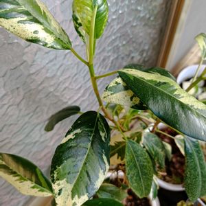 フランスゴムの木 植え替えて屋外に置くと、新芽が出てきました。 こういう斑入りも好きです❤