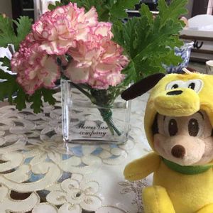 カーネーション ばかり、 また せこく 投稿💦 3週間 以上、保っています🌸 庭の ローズ ゼラニウム の 葉っぱを 切って来て、添えました。