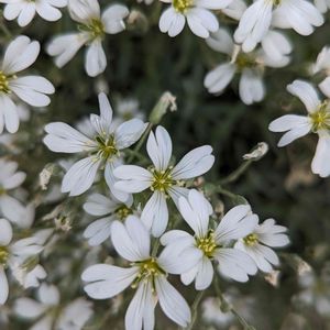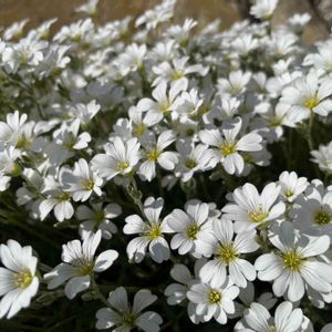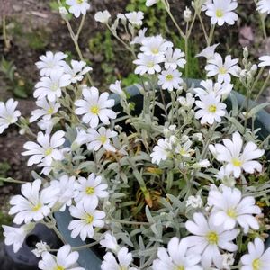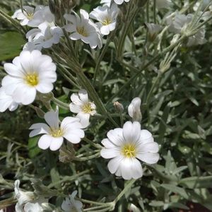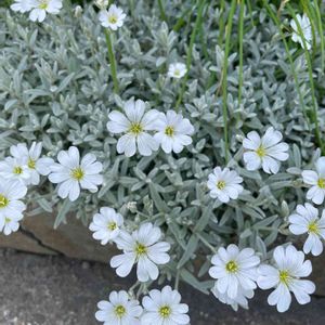【セラスチウム(白耳菜草、夏雪草)】 ヨーロッパ原産、ナデシコ科常緑多年草(一年草扱い) ヨーロッパの高山植物。 初夏に小さな白い5弁花を茎の先端につける。 花弁の先がハート型に裂け、中心部から縦に筋が入る。 花も美しいが、白い毛で覆われたシルバーリーフも美しい。茎は地面を這い、マット状に広がる。 草丈:15~25cm 花期:4~6月 花色:白 ガーデンマルシェ防府にて