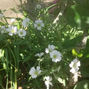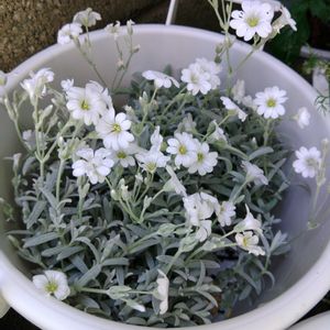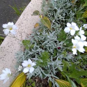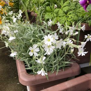 シロミミナグサ 別名:セラスチウム、ナツユキソウ お出かけ先のお店の前に咲いていました❣️ 木の枝を鉢のまわりに組んであって花が広がらずに綺麗に咲いてました💕 素敵な飾り方ですね😊 ♡の花びら、シルバーリーフ 可愛い( ´͈ ᵕ `͈ )♡