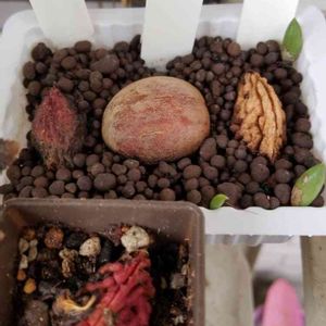 梅干しの種じゃないよ👌桃の種だよ🎵丸いのはアボカドです🍀 手前の赤い種は黄桃のもの❤️ たまにこんなことをして遊んでしまいます😅 栗とリンゴの苗あるけど、5年ぐらい経ってるけど、花も咲かないです😅 ま、芽が出てくるのを見るのが一番楽しいです💕