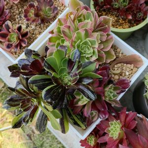 アエオニウム メデューサ錦💕 元気な子株がたくさん。 赤と黒のストライプが素敵な葉っぱ🍃です。 3月にスーパーのお花屋さんで600円で購入♡ 3枚目の写真が購入当時なんです。 お買い得でした(*^o^*)