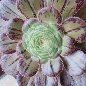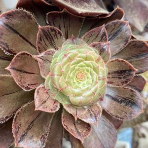 アエオニウムのまだら黒法師(綴化)です✨ 1/13に植木鉢を探しにHC行ったら色落ちしたまだら黒法師が...お日様が好きなアエオニウムが店内で...😨 緑色の葉っぱがちょっと寂しそうで連れて帰りました🤗そっから明るい日陰から慣らして、今は磨りガラス程度の日光で大丈夫なってきてます☺️葉色もまだら黒法師の特徴が復活しつつあるので、そろそろ半日日光が当たる窓辺に移動です☀️ 春前には外に出れるようにリハビリ中です🤗綴化は...正直よくわからないです😅成長点がライン状?人間で言う天パみたいな?クセ強めはお互い様や😭 写真の日付が明日になってるのはご愛嬌です😂