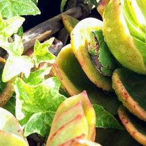 深い鉢に植え付けをしたら かなりビッグに成長した ゴールデングロー🌱 毎年住み着くカエルちゃん🐸 今年もひっそり影に隠れてました😆🎵