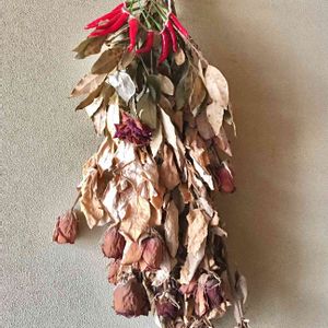 おはようございます とうがらし🌶を乾かしています。 (お嫁さんからのお裾分けです) 還暦(数年前)の時の子供達からの薔薇と、 畑の月桂樹の木から摘んで 乾かしていた小枝の上に重ねました。