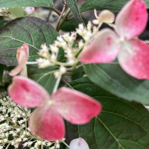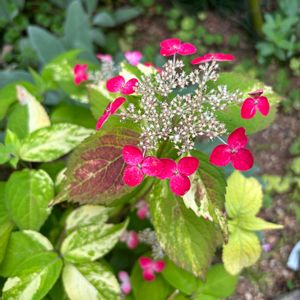 ヤマアジサイ❁くれない 紅くなってきてますよ〜 🤍から❤️へ アジサイ❁ホシアツメさんが、 紅さんと一緒に写りたい と 無理言うので🤭☺️ しゃあないなぁ~😮💨🤭☺️ 🤳パシャ (狭い小さなお庭で 鉢植えを、 ギュ~っと固めておいてます。)🙇♀🙏 ホシアツメは、それぞれのお花の色が違って 素敵 (今年は、なぜか花付きが良くありませんでした。💦)