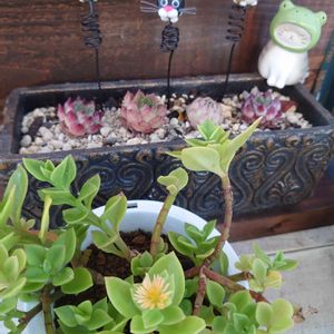 こんばんは☆*° 7月の夏祭りも中止 8月の紀の川沿いの 花火大会も中止 今年も残念な夏です😅 ライン引きの寄せ植え🍀 金属なので 高温になるけど 何とか頑張ってます❤ 見守り隊は ミルさんからの 多肉レンジャー🥜 いちごちゃんのピック🍓 🍓ケーキペコちゃんです