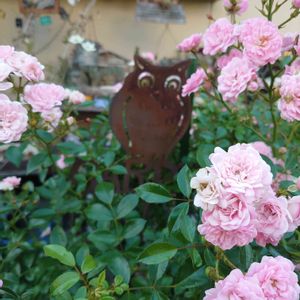 もう一つ フクロウ祭り参加 させてね❤ ミニ薔薇満開に咲きました🌹 先日の大雨で項垂れてた 枝も快晴続きで シャキーンと復活しました🌹 いつも支柱替わりに してるフクロウの 大きなピックです🦉 花に囲まれて 幸せそうです💗 連投スミマセン😅