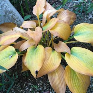 我が家では一番最後に紅葉するギボウシのハルシオンもついに色が変わり始めました〜