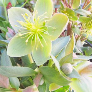 今日は、とても暖か 外出にコートはいりません。 クリスマスローズ グリーンなシングル ひとつ目開花しました。