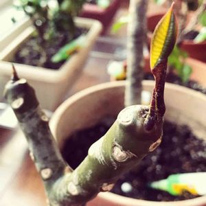 プルメリアの葉が室内に入れてやっと ニョキニョキと元気に出てきています🌱 可愛い😍嬉しい~🌺 頑張れ〜٩( 'ω' )و