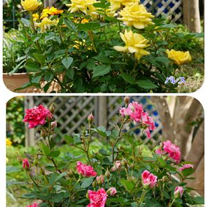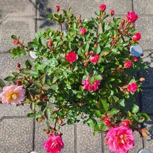 「薔薇各種の開花」 2021年5月9日の写メです。 今日は風が強くて、屋上の薔薇の花が折れたり、新梢が折れたりしています。 風は困りますね。 同じ日に、こんなに纏まった薔薇の花も見る事が少ないと思い写メしておきました。 ミニ薔薇3種類と大苗の薔薇1種類ですが、全部挿し木で増やして来た物です。 個々には、もう投稿して来ましたがまた違った感じで見て下さい🎶 ミニ薔薇 チェリーアイ マンダリーナコルダーナ タマラコルダーナ 大苗薔薇 ビブラマリエ の4種類です。