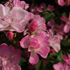 「桜貝」 系統→F. フロリバンダ 作出→京成バラ園 ※淡いピンク色で、一枝に5輪程度房咲きとなる。 長居植物園バラ園