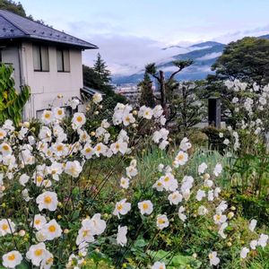 おはようございます😊 ①今日のお花、シュウメイギク 10/12、諏訪大社上社前宮、参道にて ②諏訪大社 上社前宮 上社本宮 下社春宮 下社秋宮 ③秋宮神楽殿 秋宮さざれ石 諏訪湖 四隅の御柱 雷電の手形