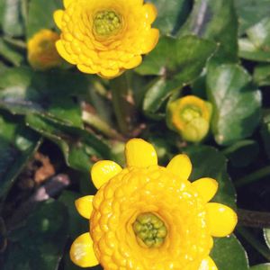 ヒメリュウキンカ 姫立金花 ヒメリュウキンカには、いろんな種類があるのかな。 この群生のタイプは、かなり小さい。 葉も土に這うように広がる。 一斉に太陽に向かう。