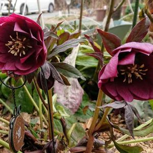 赤いダフルのクリスマスローズが 2輪並んだので投稿しました♬ 3年目の株です(っ ॑꒳ ॑c)♡.゜毎年少しずつ花数増やしています💞