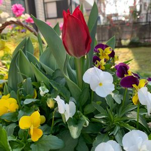 チューリップ、プリティウーマンが咲いてきました❣️ ユリ咲が欲しくて秋に買って12月に植えた、楽しみな球根です😊 種からビオラも、苗が若いのでまだまだ元気👌 🏷真っ赤な火曜日