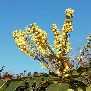 ヒイラギナンテン マホニア・チャリティ ヒイラギナンテンの仲間のうちでも、この寒い時期に立ち上がるように花をつけている。 周りがぱぁっと明るくなる。