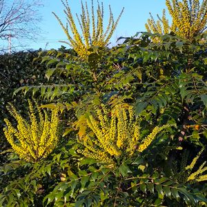 散歩中、パッと目に飛び込んで来た、びっくりの💚💛💛 ヒイラギナンテンと、ロマリィフォーリアの交配種だそうです。 開花11月~1月 木の高さ 最大約3m それにしても立派な花付き 株元を見ると直径20㎝以上はありました。