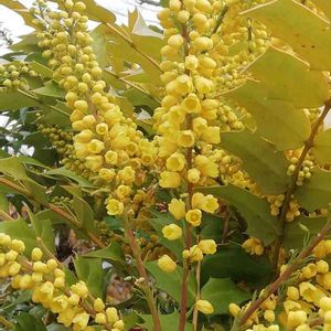 ヒイラギナンテン属の💛マホニア・チャリティー💛の鮮やかな黄色い小花を多数つけた細長い花穂が上向きに伸びた豪華な綺麗なお花を、今年も見ることができました🤗💗