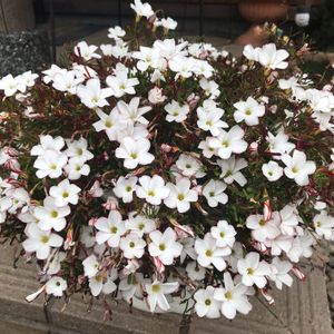 オキザリス パーシーカラー やっと鉢一杯に咲くことができました🌸🌸🌸 いい天気で暖かい日をずっと待ってました でも鉢の中をのぞくと 咲けずに蕾のまま萎れたのもたくさんあります💦