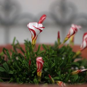 オキザリスのパーシーカラー 閉じてる時のストライプ模様が可愛い💕 100均で小さな陶器❓のミニチュアハウスを見つけて 花壇に置こうとお買い求め〜😁 真っ白だったので手持ちのペイントマーカーで屋根塗った😓 赤と青が良かったなぁ〜🤔