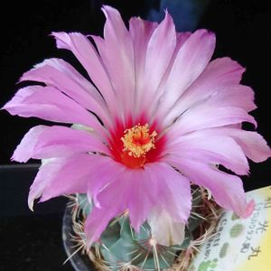 こんばんは😄 一斉紹介(64)です〜❗️😄 サボテン科 テロカクタス属 テキサス州からメキシコにかけて約20種程が自生、強刺類(他には、フェロカクタス エキノカクタスが有り)と呼ばれる小型種❗️😄 ⭐️和光丸(112) Thelocactus bicolor var wagnerianus❗️ 鮮やかな赤い刺が魅力的なサボテン(我が家の子は色褪せてます❗️😣) 肥料過多で細く伸びるそうです❗️😅