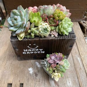 🍀エケベリア+α🍀 もうひとつセコセコつくりました🪴 鉢とのバランス的にはどうなのよ⁉︎⁉︎ 先日のウッドプランターの、なんとなく気に入らなかったからつくり直しました😙