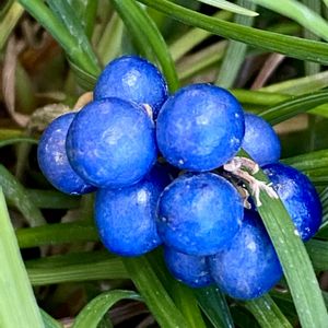 今日の庭の様子 リュウノヒゲ こんもり茂った葉っぱの中にひっそり隠れているリュウノヒゲの実。最初は緑色から薄いブルーそして濃いブルーへと変化する。 神秘的なブルーまるで宝石のラピスラズリです。🔵