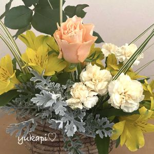 昨晩は。。息子一家が 私の誕生日と母親の卒寿💜 お祝いに来てくれました㊗️ 母が頂いた花束を💐 アレンジしてみました♪ カゴが小さかったので🧺💦 2本のバラは母の希望で 花瓶に(//∇//) 庭のシロタエギクとリーフを 拝借して🌱 映えさせました✨