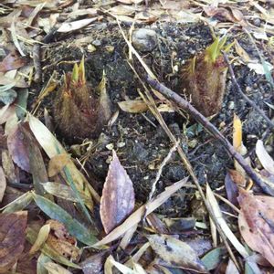我が家の竹の子。土がこんもりしていた所の下に入って、竹の子の芽がありました。