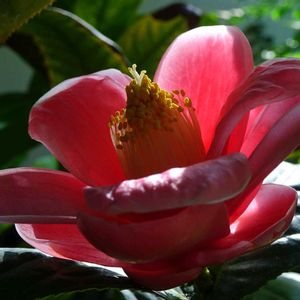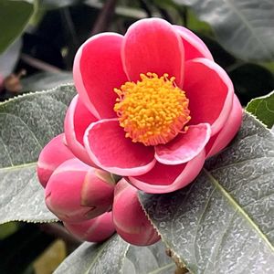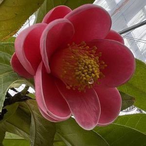 ハイドゥン(ベトナム椿) 和名 カイドウツバキ(海棠椿) ベトナム原産のツバキ科の熱帯低木 花弁が分厚く、蝋細工のようで、和菓子にも見えるローズピンクの大きな花 蕾も大きい 亜熱帯地方のもので温室に咲いています