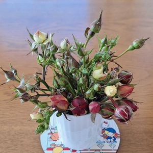 寒くなってきましたが頑張ってくれてる薔薇とミニ薔薇🌹 今は蕾が色づいて、近々また咲きそう⤴️ ⬆️のミニ薔薇カルーセルコルダナさんは久しぶりに蕾が夏より大きくぷっくりと膨らんできました。 香りもあるミニ薔薇さんなので楽しみです。 (和歌山から連れ帰った子です) ②今夏、とってもたくさんお花が咲いて楽しませてくれた一重のスプリットペタルさん 蔓が細くてクネクネ、狭い所で咲かせたのもあってかなり絡まってます。 だいぶ整理して種を取れそうなのだけ残しています。 今現在これだけ種とれてます GS友さんありがとう🩷